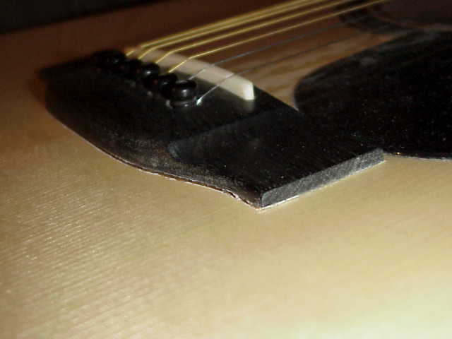 Da dies natürlich nicht immer der Fall ist, lösen sich öfters mal Stege von akustischen Gitarren. Die Ursachen dafür sind öfters witterungsbedingt (Trockenheit! Feuchte! Hitze!) aber oft auch Materialversagen und nicht optimale Herstellung. Versagt die Leimverbindung schlagartig (gerade witterungsbedingt), macht es einen Knall und der Steg steht ab. Kollabiert das mit der Zeit, öffnet sich der Steg an der Rückseite, verformt sich und reißt dann ab. Löst sich eine Deckenleiste innen, wölbt sich erst die Decke und löst dann den Steg. Hinzukommen auch oft Schäden auf dem Verstärkungs Holzstück an der Innenseite der Decke. Es ergeben sich also aus den Schadensbildern eventuell mehr Reparaturaufwand, als man auf den ersten Blick vermuten möchte. Die folgende Beschreibung, repariert ein einfaches Nachleimen eines witterungsbedingten Schadens. Es haben sich keine inneren Leisten gelöst, die Decke hat sich etwas gewölbt und die Verleimung muß mit Hautleim durchgeführt werden.