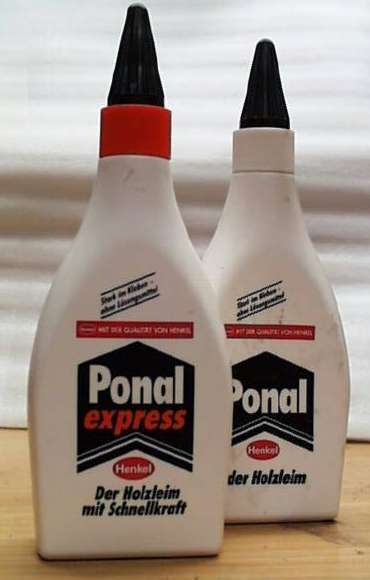 Hier in Deutschland trifft man im Hobbybereich sehr häufig auf Ponal Weißleim (oberes Bild hinten). Ich habe diesen am Anfang öfters verwendet bis mir eines Tages eine etwas höher belastete Fuge immer wieder aufging. Ich denke, dass der Weißleim gut für "Filzhüte auf Kasperlpuppen zu kleben" ist, aber für den Gitarrenbau hat er zu viele Weichmacher drin, nicht für diesen Zweck zu empfehlen. Hingegen der "Express" schnell und fest aushärtet. Man bekommt ihn auch mit Dampf wieder auf. Nachteilig ist, dass er milchig aushärtet, wenn irgendwo Leim nicht entfernt wurde.