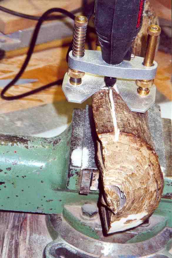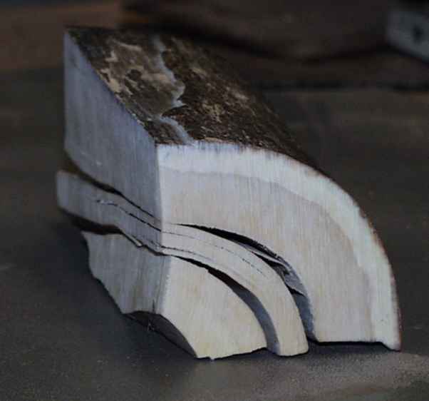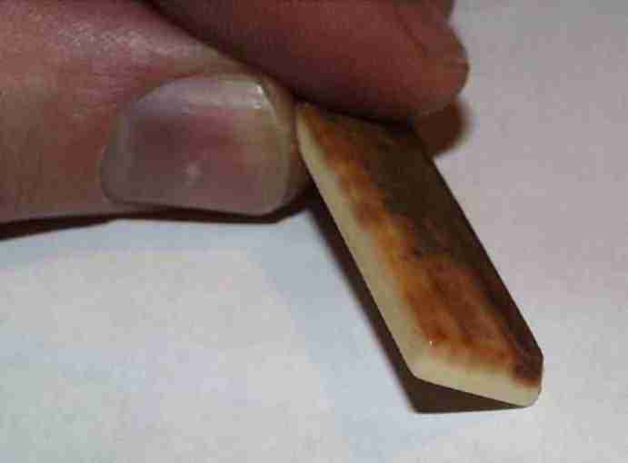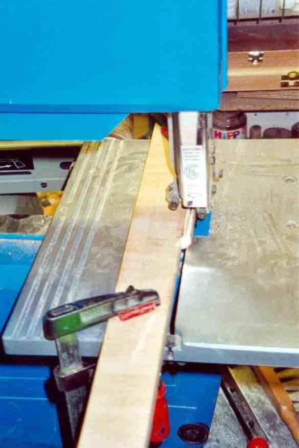 Das Stück ist etwas länger als 30cm und wiegt ungefähr 2kg. Es ist ein Halbzahn und wurde von einem größeren Stoßzahnteil abgetrennt und fachgerecht konserviert. Da ich von außen nicht einschätzen konnte, wie es innen aussieht, habe ich mit dem Dremel ein Stückchen ausgefräst. Es ist ziemlich weich und riecht wie streng nacht verbranntem Haar oder so. Dieses Stück wurde dann auf der Bandsäge in 3mm breite Streifen zertrennt, an der Bandschleifmaschine parallel geschliffen und auf die engültige Form geschnitten.