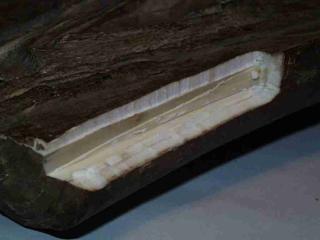 Nachdem das Material sich als äußerst brauchbar erwiesen hatte (es kann auch strark bröselig und nicht polierbar sein), zerschnitt ich das Fragment und verarbeitete es weiter. Mit Schmirgelpapier, Feile und Polierscheibe kann man ein sehr geschmeidiges Gitarrenteil herstellen.