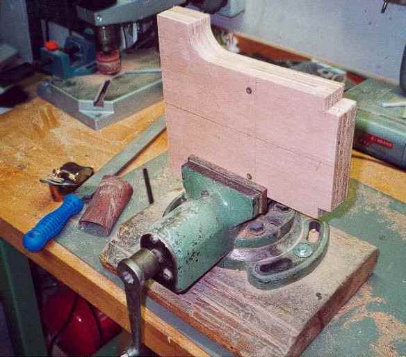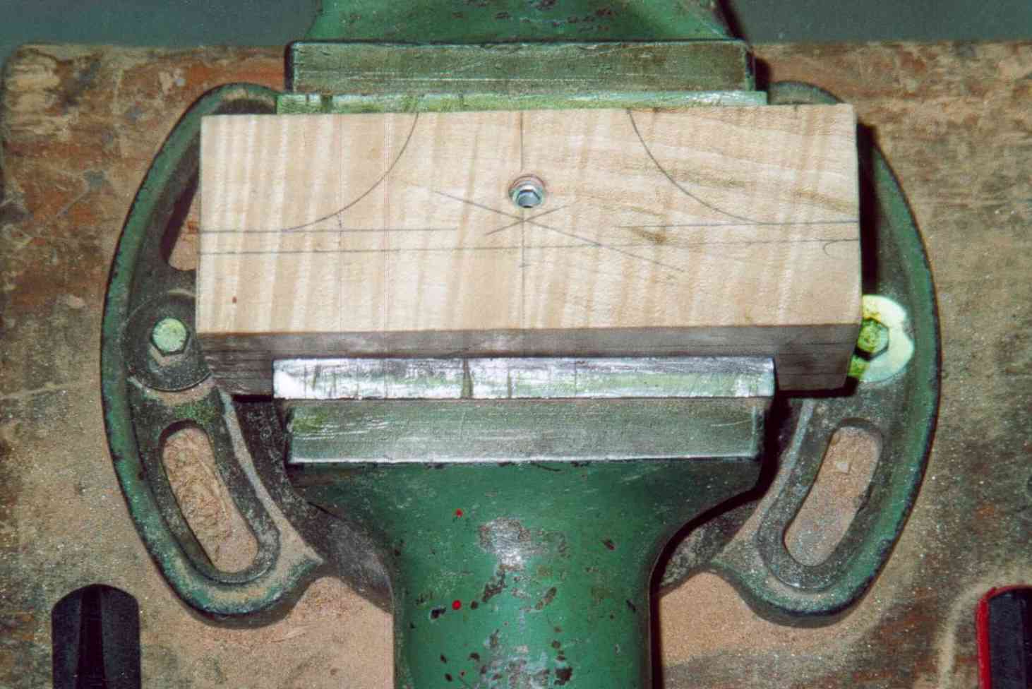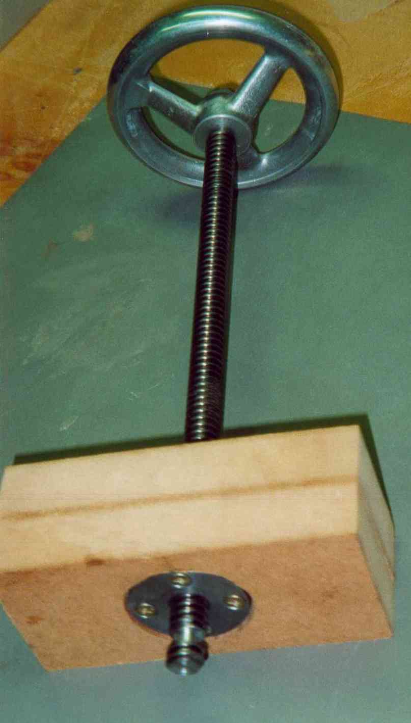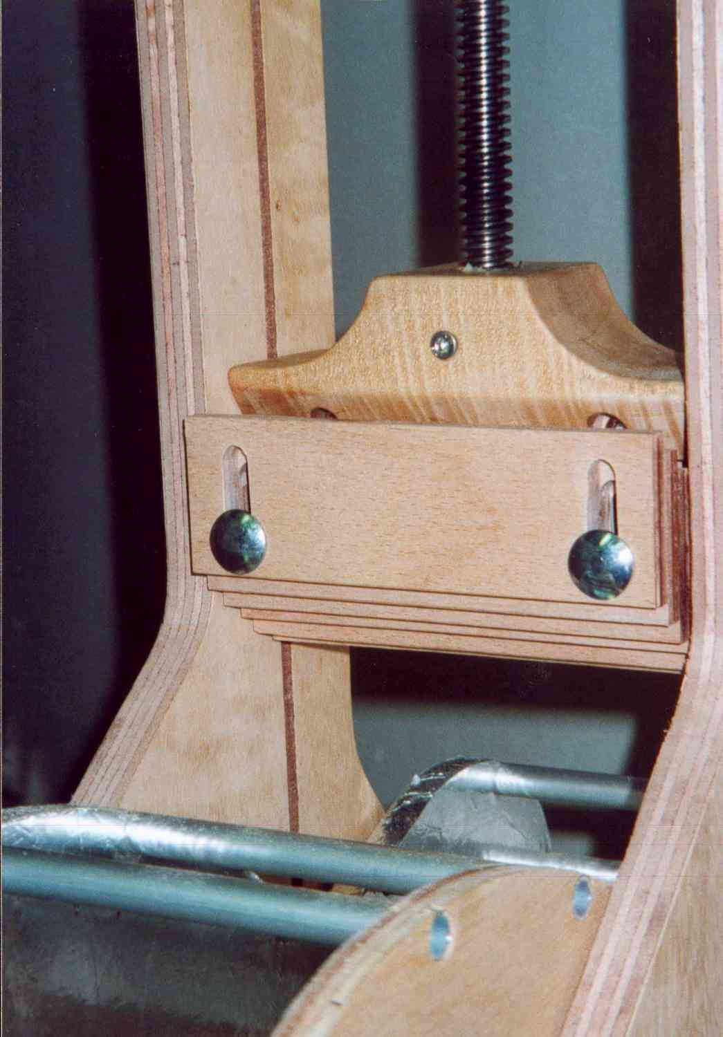 Der Klotz unten nimmt die Formteile und die Trapezspindel auf. Ich habe ihn aus Ahorn hergestellt. Die Spindel hat auf ihrer Unterseite einen Einstich für eine Schraube. Diese Schraube habe ich mit einer Setzmutter von der Seite her in das Holz eingesetzt. Der Vorteil dieser Methode besteht darin, das metrische Gewinde der Schraube ein feinfühliges Einstellen erlaubt. Auf der Unterseite des Klotzes muss eine Nut eingearbeitet werden, in die dann das Befestigungsholz für die Formteile eingesetzt wird (habe ich auch mit Setzmuttern gemacht). Hat man das gemacht, müssen die unteren Ecken grosszügig gefast werden, man gibt den Formteilen mehr Platz und kann besser sehen was passiert. Mit der Bandsäge und Feilen wird die Aussenkontur dann hergestellt und mit Lack geschützt.