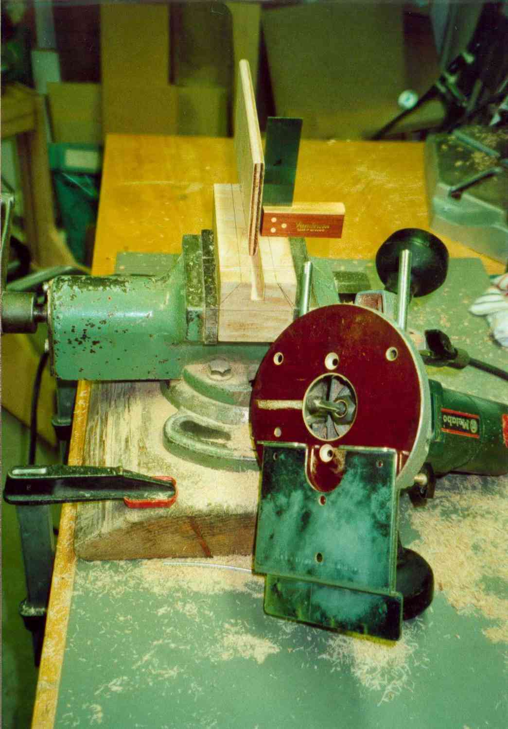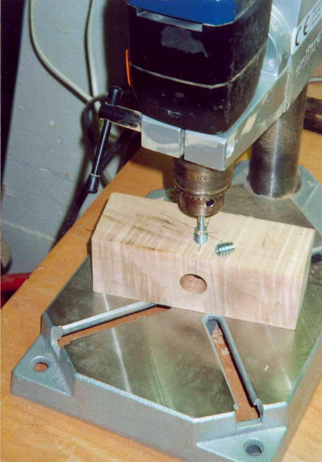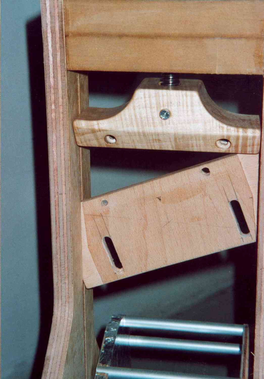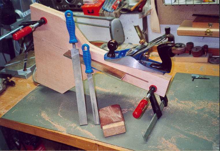 Der Klotz unten nimmt die Formteile und die Trapezspindel auf. Ich habe ihn aus Ahorn hergestellt. Die Spindel hat auf ihrer Unterseite einen Einstich für eine Schraube. Diese Schraube habe ich mit einer Setzmutter von der Seite her in das Holz eingesetzt. Der Vorteil dieser Methode besteht darin, das metrische Gewinde der Schraube ein feinfühliges Einstellen erlaubt. Auf der Unterseite des Klotzes muss eine Nut eingearbeitet werden, in die dann das Befestigungsholz für die Formteile eingesetzt wird (habe ich auch mit Setzmuttern gemacht). Hat man das gemacht, müssen die unteren Ecken grosszügig gefast werden, man gibt den Formteilen mehr Platz und kann besser sehen was passiert. Mit der Bandsäge und Feilen wird die Aussenkontur dann hergestellt und mit Lack geschützt.