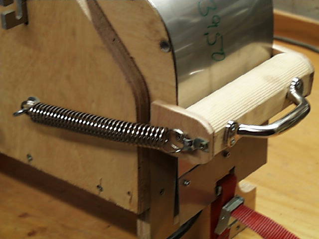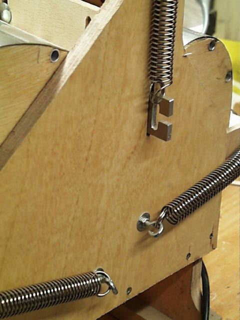 Auf dem Flohmarkt habe ich einen altmodischen Muskel-Expander als Federnlieferant gekauft. Man benötigt dazu 3x2 Paar. Mit dem Schleifeinsatz auf dem Dremel habe ich die Dinger abgelengt und per Kombizange dann die Ösen nachgearbeitet. Aufgehängt werden die Federn an Haken. Ich habe ganz gute Erfahrungen gemacht mit Gewindehaken, mit ein paar grossen Beilagscheiben und zwei Muttern halten die super.