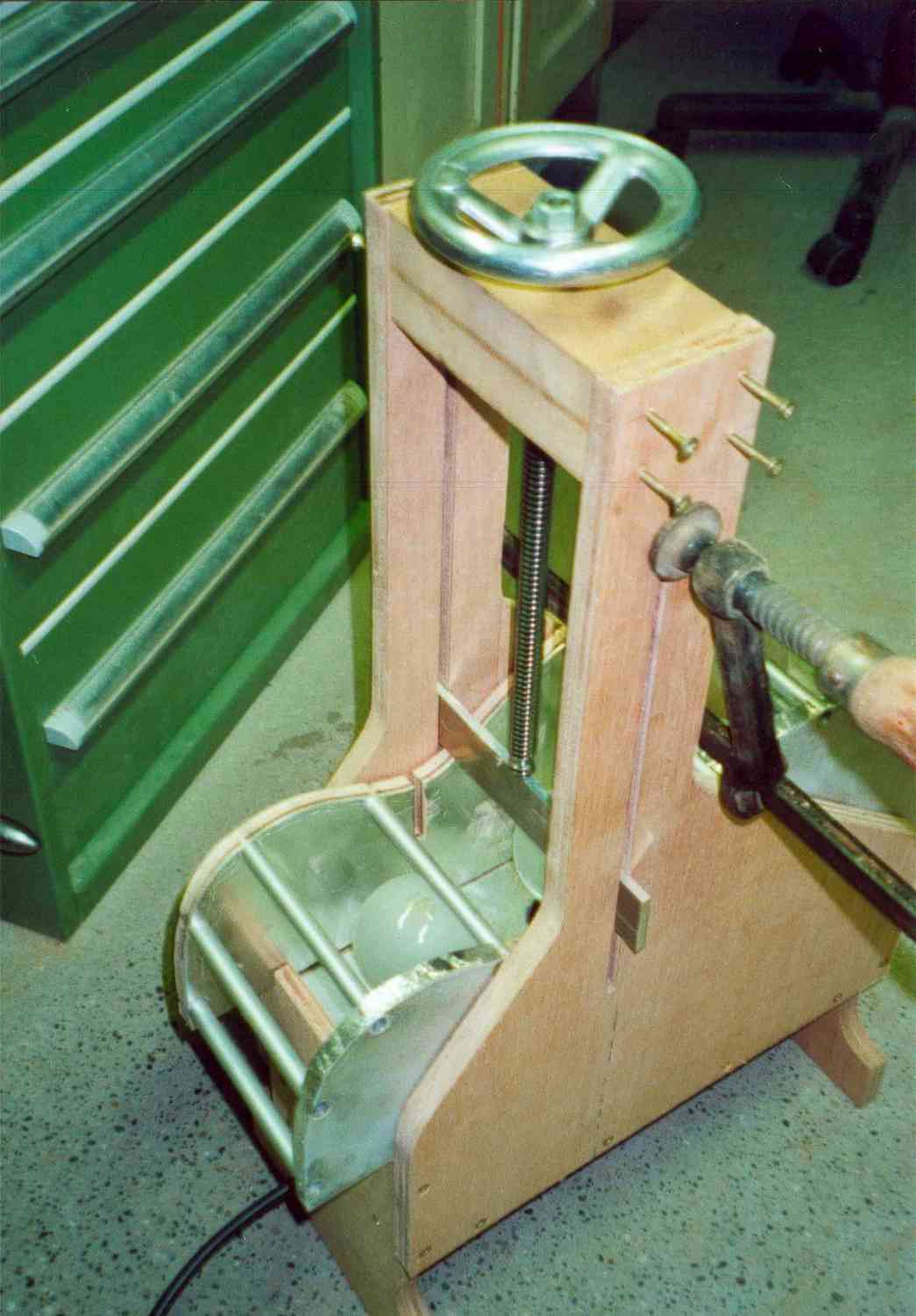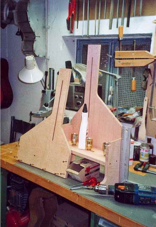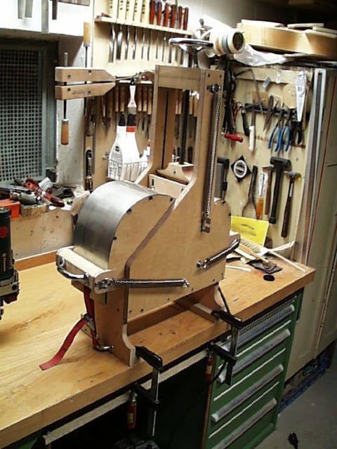 Auf einfache Art kann man sich mit einer Vorrichtung hier helfen. Der aus den USA stammende Gitarrenbauer und Reparateur Charles Fox hat durch seine "Universal Wood-Bending Machine" einen Standard gesetzt, der sowohl in Kleinstserien in der Werkstatt als auch bei Firmen wie z.B. Martin Guitars in Sonderserien eingesetzt wird. Das Prinzip ist einfach: Eine Hälfte des Gitarrenkorpus wird als Hohlform hergestellt. Eine Art Presse nimmt diese Hohlform auf. Im Innenraum der Hohlform bringen drei Glühbirnen a' 200Watt genügend Wärme auf, um das Zargenholz wie auf einem Handbiegeeisen plastisch zu verformen. Das Holz der Zarge wird zum Schutz gegen Bruch zwischen zwei 0,5mm starke Edelstahl-Bleche gelegt. Die Bleche verteilen zum einen die Wärme, zum anderen die Kraft der Presse. Presse nenne ich die Vorrichtung deswegen, weil ein, genau in die Taillie passender Schuh, über eine Trapezgewindespindel Kraft auf das Edelstahlblech/Zargenholz Sandwich aufbringt und es so an die Hohlform andrückt. Das Sandwich ist an beiden Enden an der Presse befestigbar.