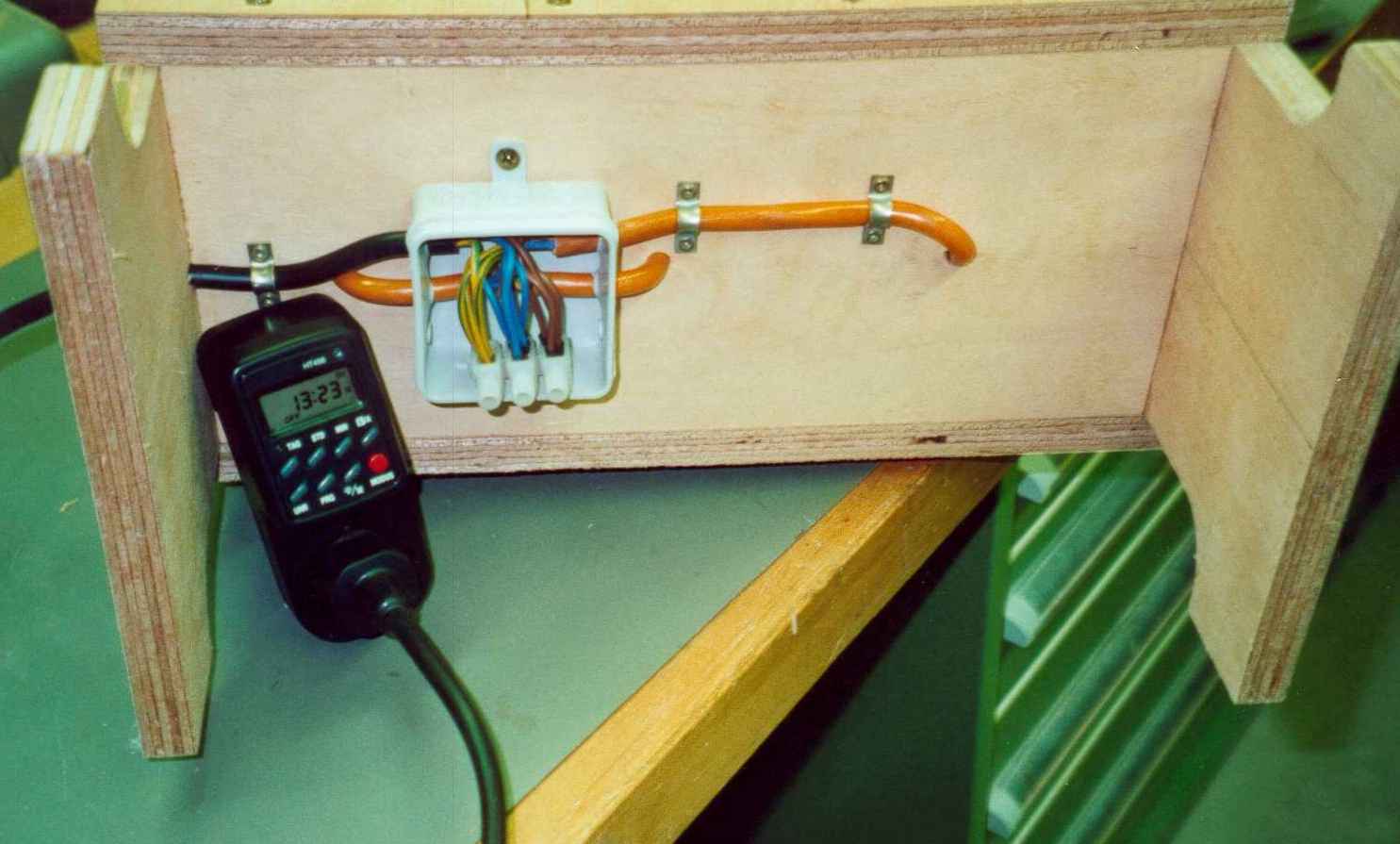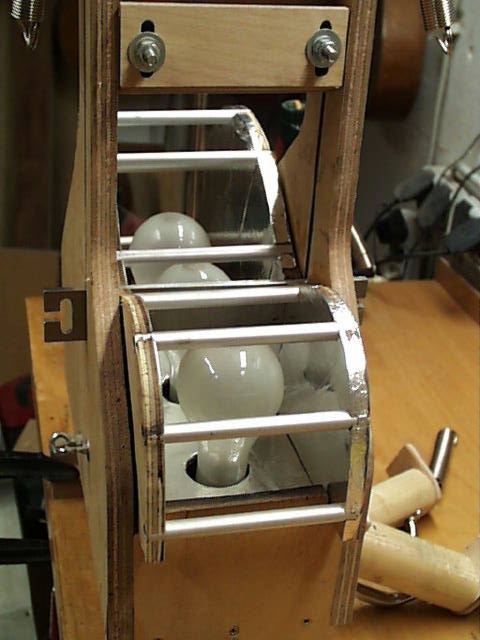 Sind die Füße und die Seitenteile soweit, entsteht nach dem Zusammenschrauben ein Kasten. Im Inneren finden drei Lampen E27 jede mit 200W "Heizleistung" platz. Die gesamte elektrische Ausstattung muss hitzebeständig ausgeführt werden. Auf der Unterseite habe ich eine Klemmdose angesetzt und die Leitungen aus den drei Fassungen miteinander zu verbinden. Jetzt wäre eine Einbau-Zeitschaltuhr gut. Ich habe mir eine zum Zwischenbau an die Zuleitung gekauft. Wichtig ist, dass man minutenweise einstellen kann. Den Stecker habe ich mit der Zeituhr verklebt, damit nicht irgenjemand auf die Idee kommt, das Ding laufenzulassen ohne der automatischen Abschaltung (Brandgefahr!).