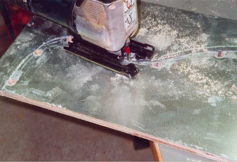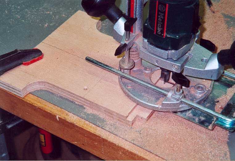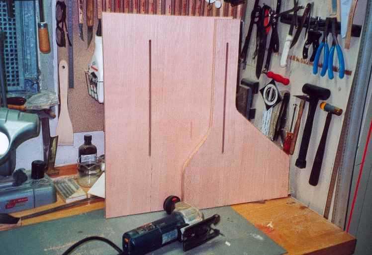 Vom Plan habe ich die Außenmaße auf eine Sperrholzplatte 19mm übertragen. Im noch rechteckigen Zustand der Platte muss per Oberfräse der Führungsschlitz eingefräst werden. Dabei ist zu beachten, daß die Schlitze gleichmäßig breit sind und daß sie im Rechten Winkel zur Bodenseite eingebracht werden. Hat man beide Schlitze, kann die Außenkontur ausgesät und geschliffen werden.