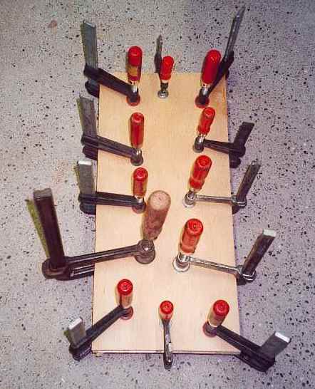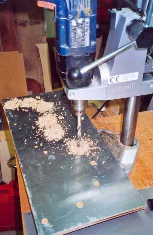 Sie besteht aus zwei Seitenteilen, die mit Rohren zueinander gehalten werden. Zum Schutz vor der Wärme, werden die Seitenteile (jeweils die Innenseiten = spiegelverkehrt hinlegen!) mit Alufolie beklebt. Ich habe auf einer Seite den Versuch gemacht, ob es besser ist, diese mit Alublech zu schützen, mit dem Resultat nach mehrmaligem Gebrauch, dass es mit Alufolie genauso hält und eben schneller herzustellen ist. Als Verbindung habe ich Ø12x1mm Alurohre gekauft und 12 Stangen auf die Länge von 150mm zurechtgeschnitten, mit einem 12mm Forstnerbohrer passen die Rohre dann stramm hinein. Die Bohrungen für die Stangen müssen sehr genau gesetzt werden, die zu biegende Zarge liegt auf den Seitenteilen und eben auf den Rohren auf. Tangieren diese Rohre nicht und stehen z.B. hervor, geht das direkt in die Qualität der Gitarre ein. Einfach ist es dann, wenn man die zu bohrenden Teile aufeinander festmacht und gleichzeitig bohrt.