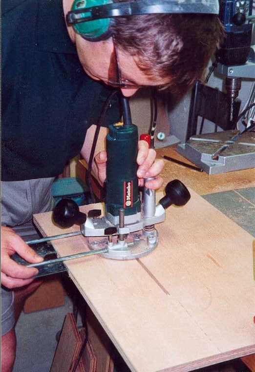 Aus den 250x230x19 grossen Sperrholzbrettern werden die Füße hergestellt. Mit der Oberfräse werden je eine Stufe zum Einsetzen der inneren Lichtabweiser eingearbeitet.