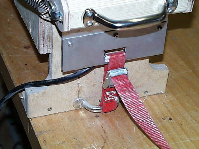 Die zu biegenden Zargen werden zwischen zwei Unterstützungsbleche gelegt. An den Enden braucht man Löcher um einen Gurt hindurchzuführen. An den Füssen habe ich zwei kleine Griffe befestigt. Durch die Griffe und Löcher wird ein Spanngurt gelegt, der das Blechpaket während des Biegens festhält. Der Pauplan schlägt Lederriemen und Spundhaken vor, mit dieser Konstruktion bin ich aber auch sehr zufrieden.