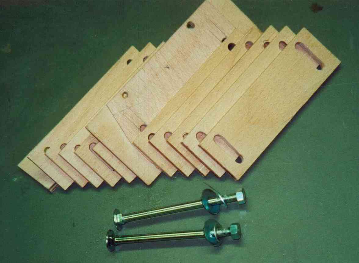 Man benötigt laut Bauplan zwei Spannschuhe, mann kann bei schwierigeren Formen aber auch drei brauchen. Mit Schellen habe ich die Federn nicht aushängbar daran festgemacht. Ein einfacher Griff reicht zum Verschieben.