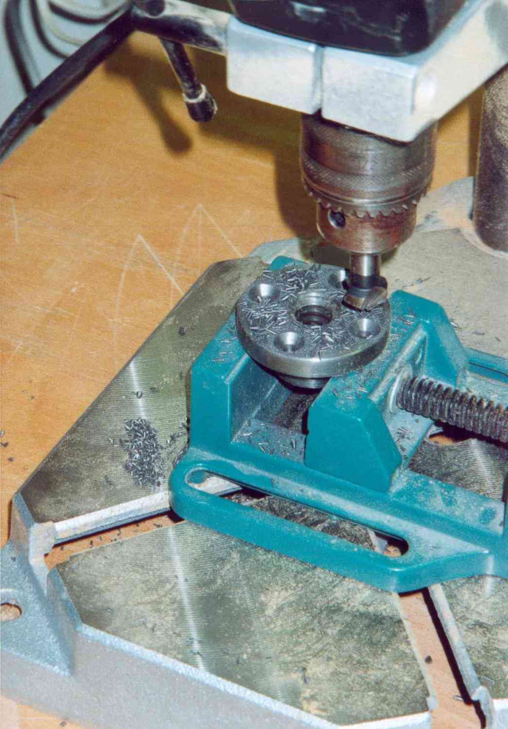 Die Spindel presst an der Taille des Korpus einen Fromschuh auf die Halbform. Günstig und relativ einfach kann man diese Spindel als Trapezgewinde ausführen. Man kann sie als Meterware kaufen. Die Endenbearbeitung erfolgt auf der Drehbank. An einem Ende muss ein Handrad hin (ich habe ein M12 Gewinde hingemacht und dann mit einer Mutter gekontert) an das andere sticht man eine Nut ein in die eine Schraube einsetzt an dem der Formschuh befestigt ist. Ein Holzklotz nimmt die Spindelmutter auf. Am besten kauft man eine Flanschmutter, je nach Ausführung muss man die Löcher selber noch bohren. Also Mutter bearbeiten, Holzklotz an Mutter anpassen und in den Kasten befestigen.