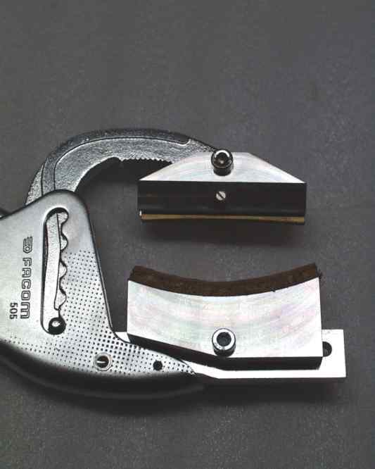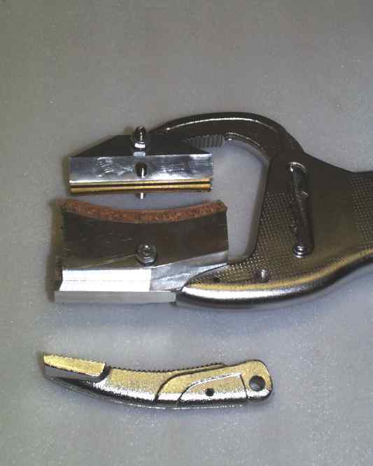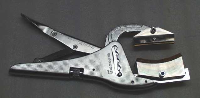 Diese Zange kommt eigentlich aus dem Metallbau. Sie wird dort zum Festhalten bei Schweißarbeiten eingesetzt und ist sehr robust. Nach einigen Veränderungen kann sie zum Einpressen von Bundstäbchen verwendet werden.