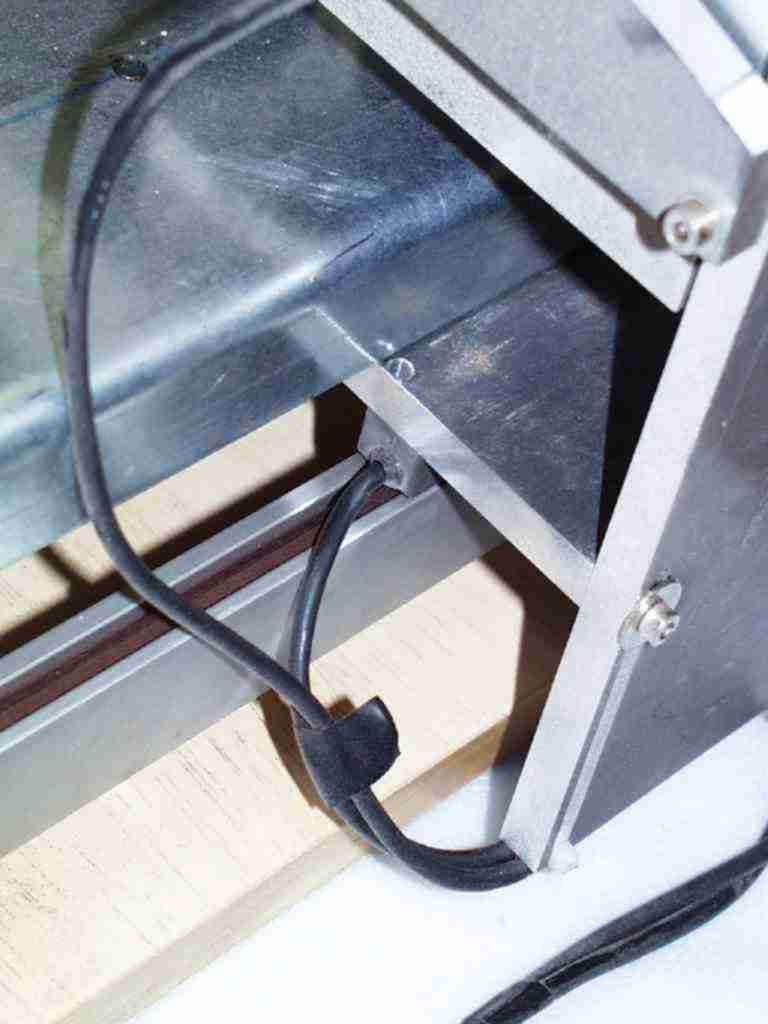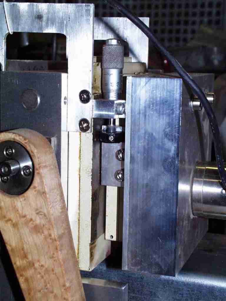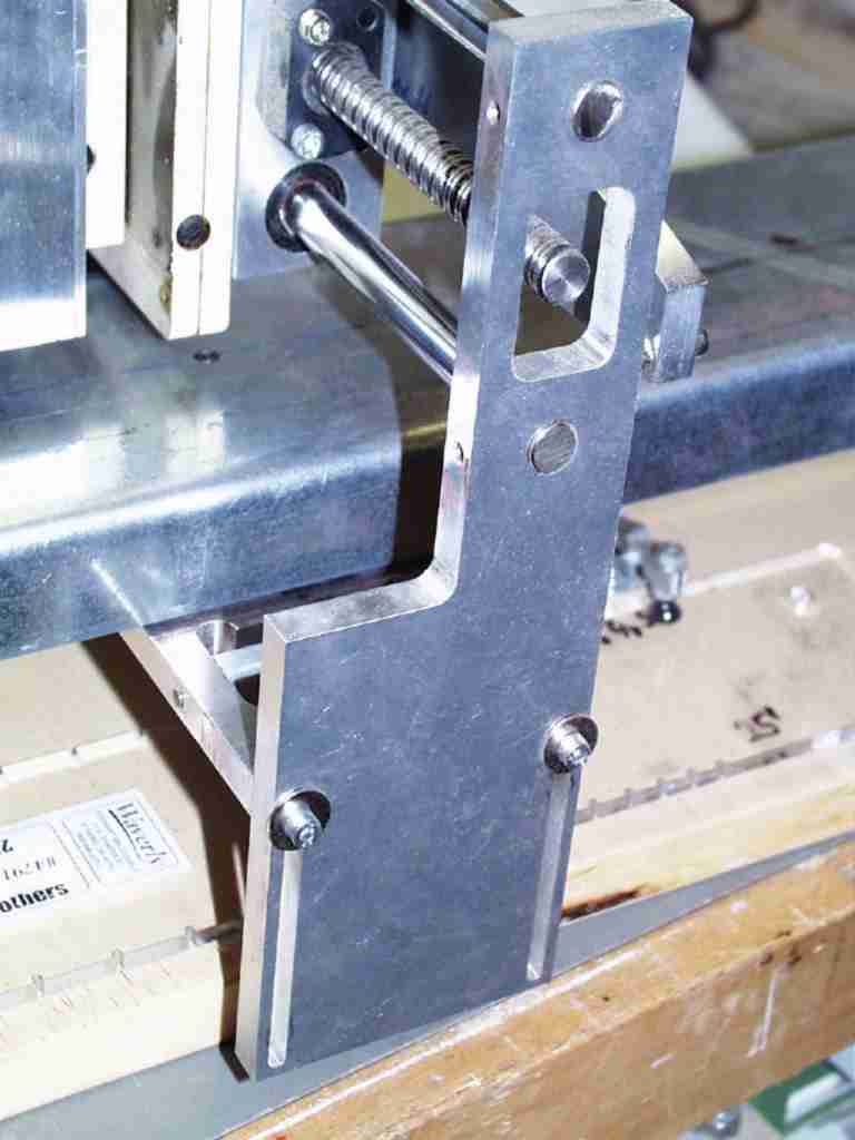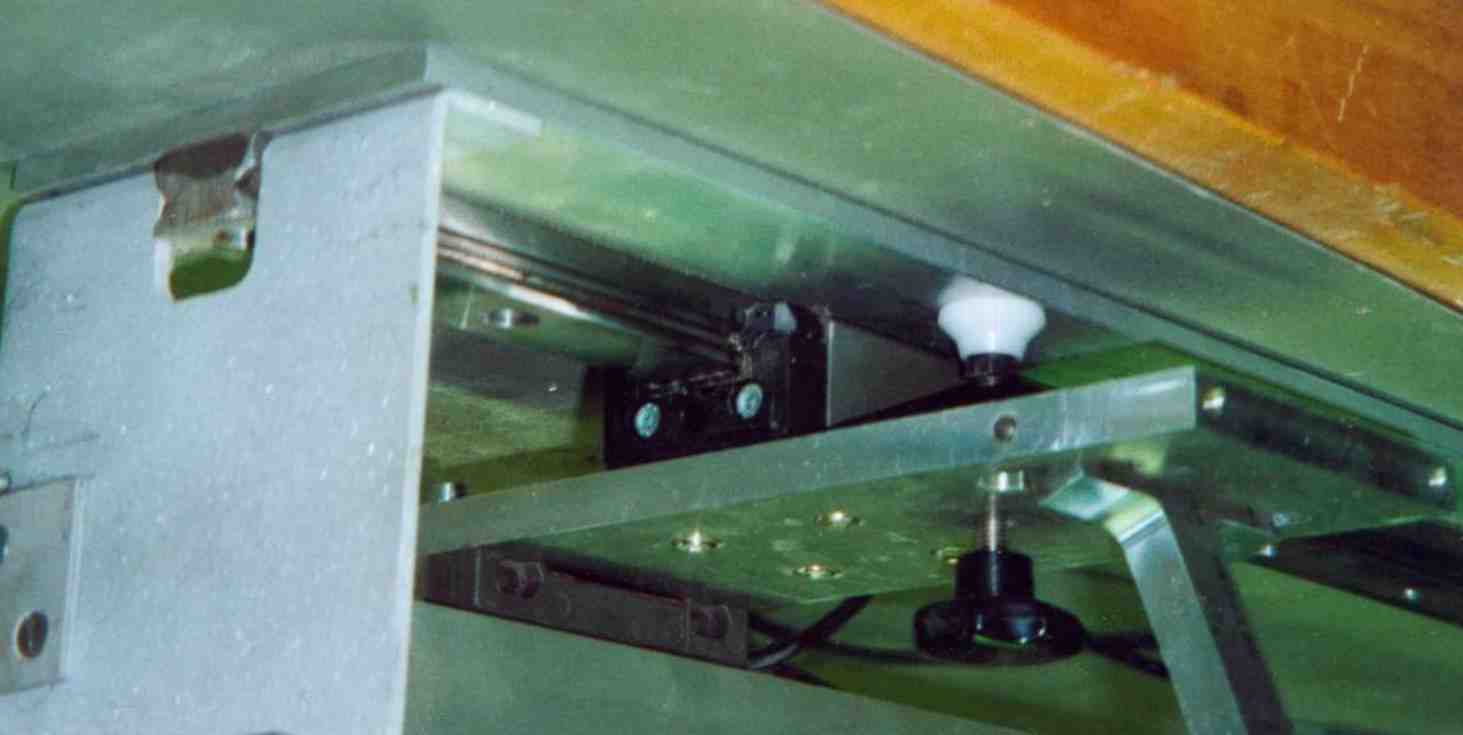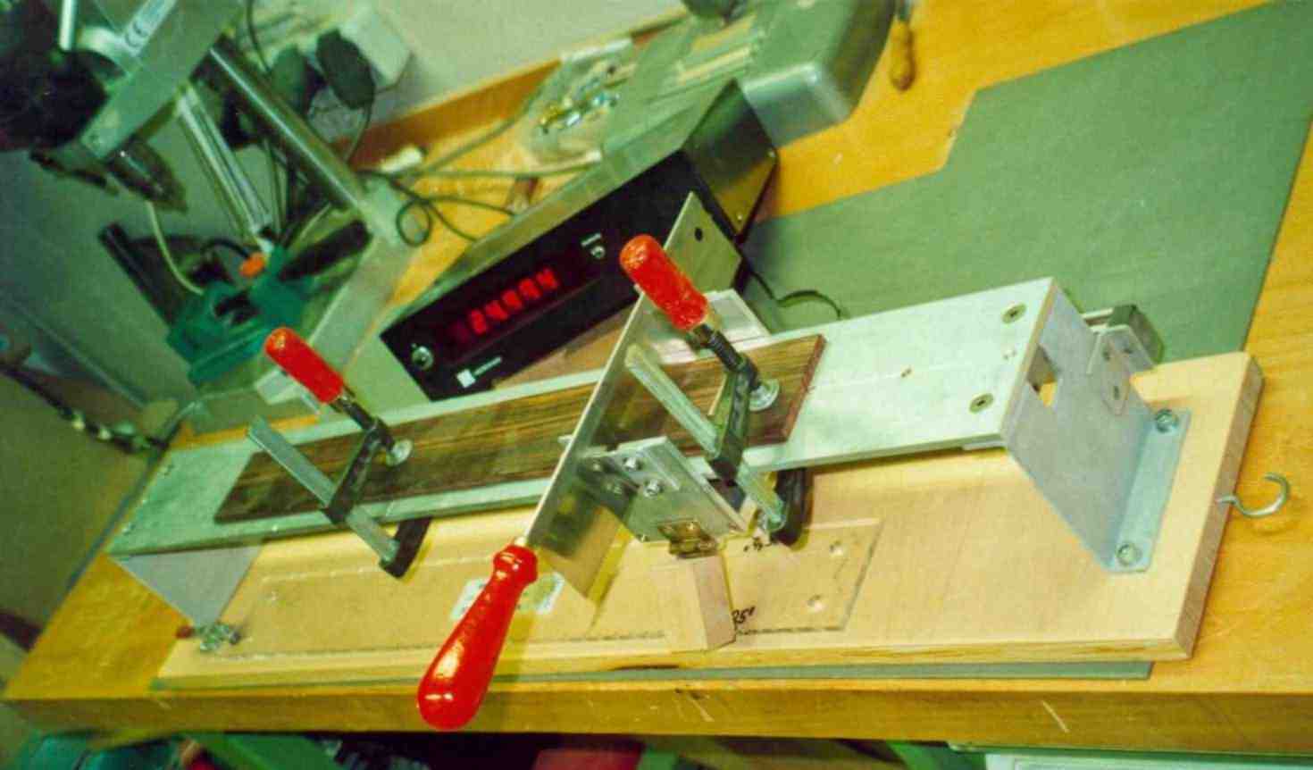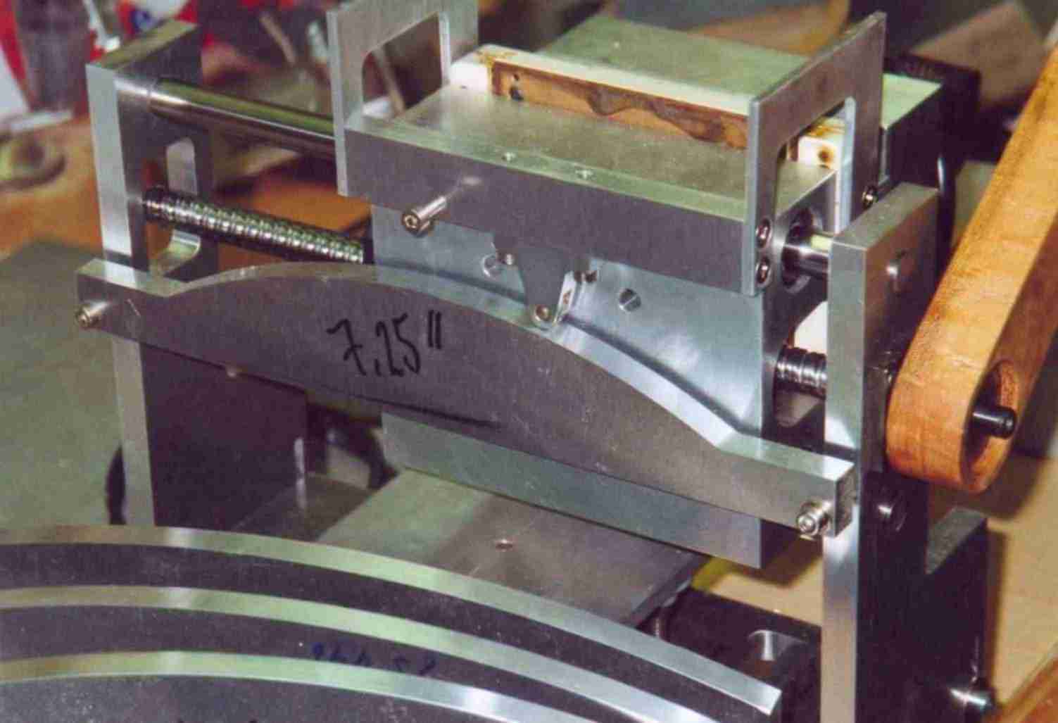 Holzgrundplatte, Linearachse auf der Unterseite. An dem Führungswagen ist die Sägeführung angebracht (Seitlich und in der Höhe). Der Führungswagen hat eine Verbindung an einen stationären Digitalmassstab aus einer Werkzeugbearbeitungsmaschine. Über ein Auslesegerät kann ich jede beliebige Position bestimmen und anfahren. Ich habe mir eine Tabelle für die gebräuchlichsten Mensuren gemacht und stelle den Führungswagen an die Position und klemme mit einer Flügelmutter von unten den Wagen. Schneller geht es, wenn ich eine Plexiglass Schablone verwende. Diese klemme ich auf die Holzgrundplatte und über einen schwenkbaren Holzklotz mit passendem Stift fahre ich die benötigten Positionen an.