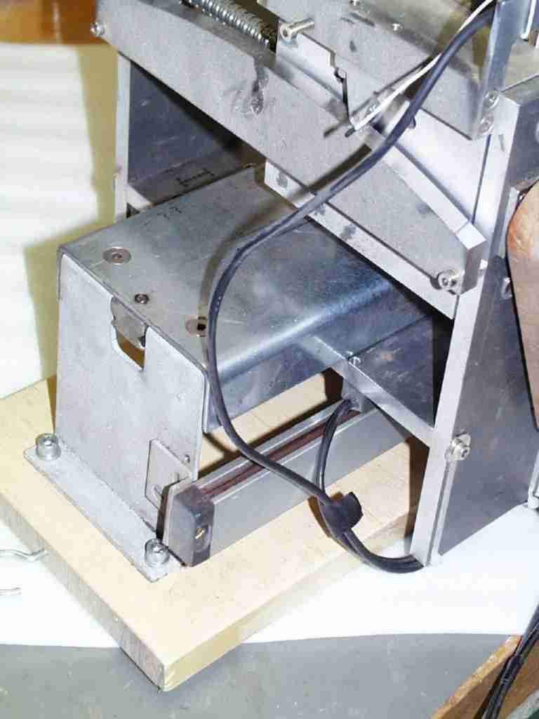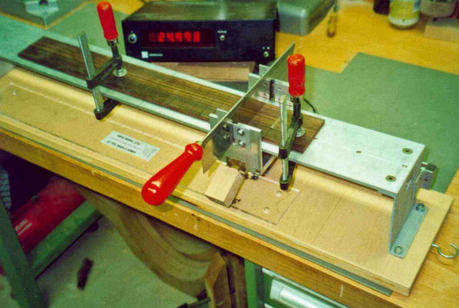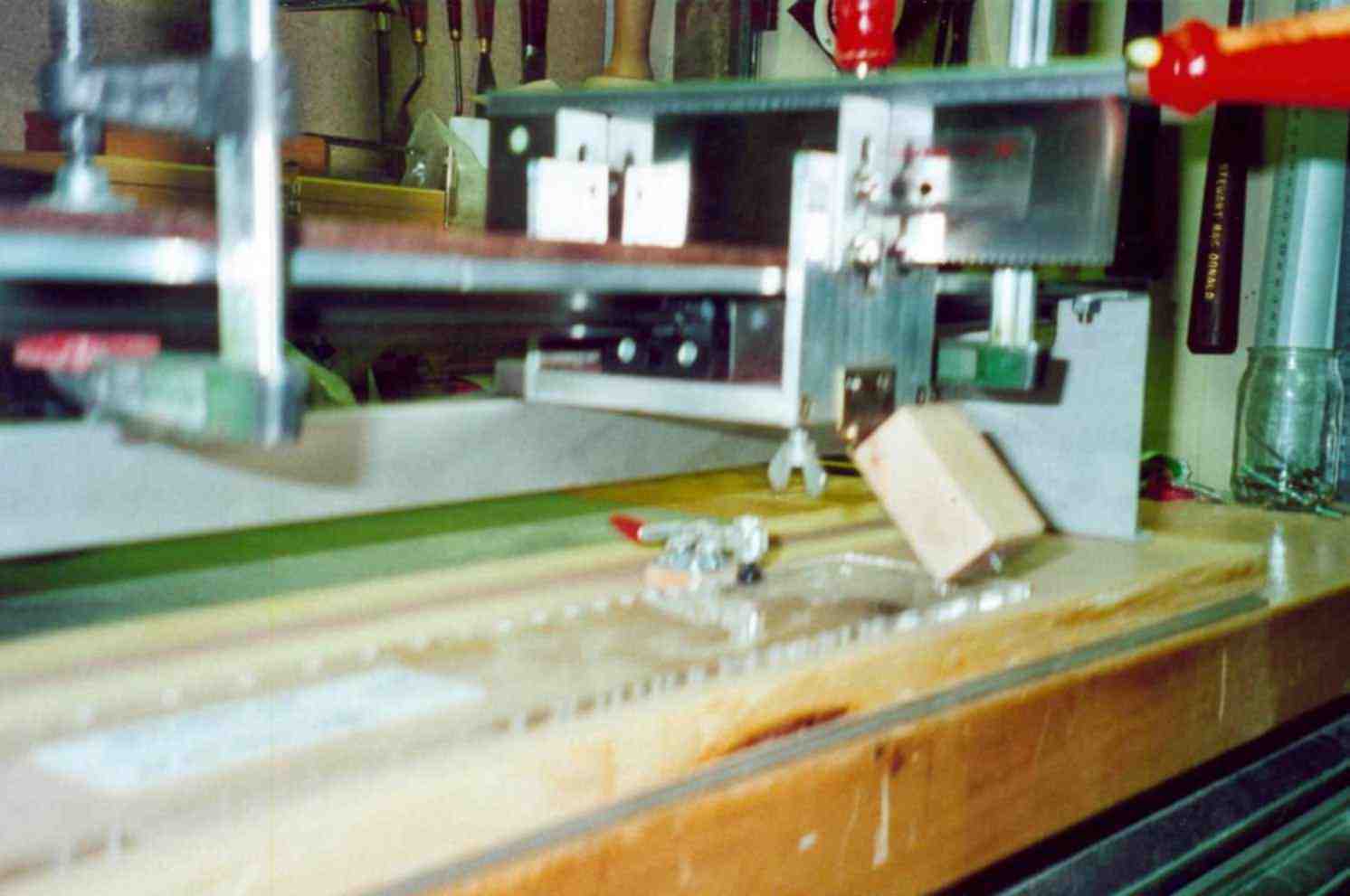 Es gibt auch verschiedene Einsägetechniken . Wenn jemand nur immer eine Mensurlänge baut, eignet sich hervorragend eine motorisch angetriebene Welle auf der in den richtigen Abständen etwa Ø100mm grosse Kreissägeblätter in der richtigen stärke aufgereiht sind. Auf einem Schiebeschlitten fährt man das Griffbrett auf einmal über alle Sägeblätter - fertig. Eine andere Methode ist die mit der Kreissäge: man sägt jeden Schlitz einzeln indem man auf die Oberseite des Griffbrettes eine Schablone aus Plexiglas befestigt in deren Aussparungen ein kleiner Stift passt. nach jedem Schlitz versetzt man einfach die Schablone (kaufbar beim Spezialversand). Eine Handmethode ist die auf der Handsägevorrichtung (Gehrungssäge). Wieder über eine Schablone und Stift geführt versetzt man das Griffbrett nach jedem Schlitz nur, dass man den Schlitz mit einer Feinsäge von Hand einsägt. Meine Methode ist eine Art Kombination, es bewegt sich nicht das Holz, sondern die Säge wird seitlich verschoben. Über einige Zeit habe ich die Vorrichtung auch weiterentwickelt. Beide Varianten arbeiten hervorragend, bei der ersten muss man halt von Hand sägen, bei der unten beschriebenen hat sich am prizipiellen Aufbau nichts geändert, nur dass ich einen Motor angebaut habe und die Feineinstellung wesentlich einfacher ist.